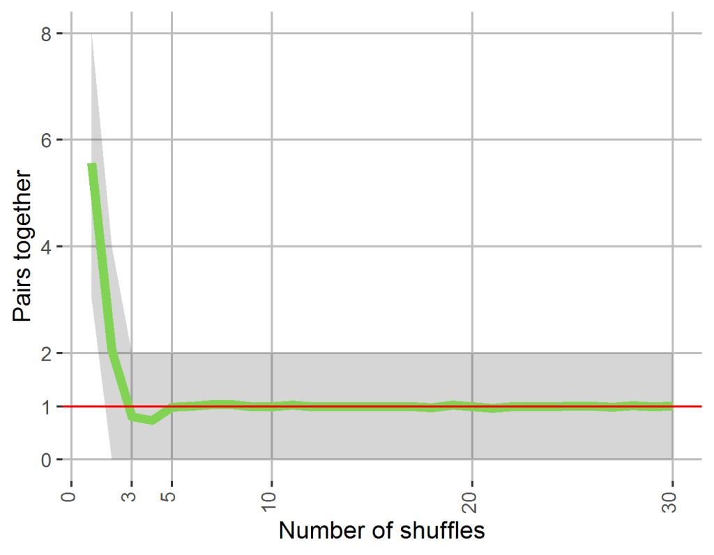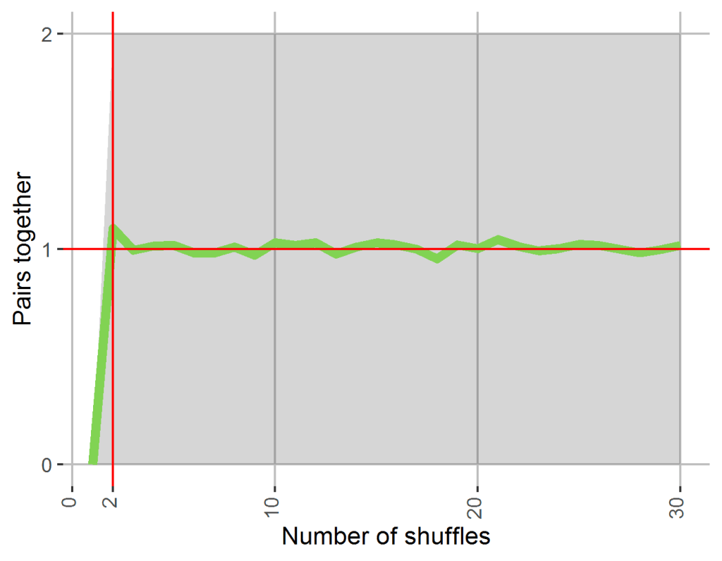 If you completely randomise the deck, 90% of the time 0, 1 or 2 pairs will be next to each other, with an average of almost exactly 1 pair together. So the goal is to get close to this range when starting off with a deck that’s entirely in order (which it normally is at the start of a tournament after verifying your deck).