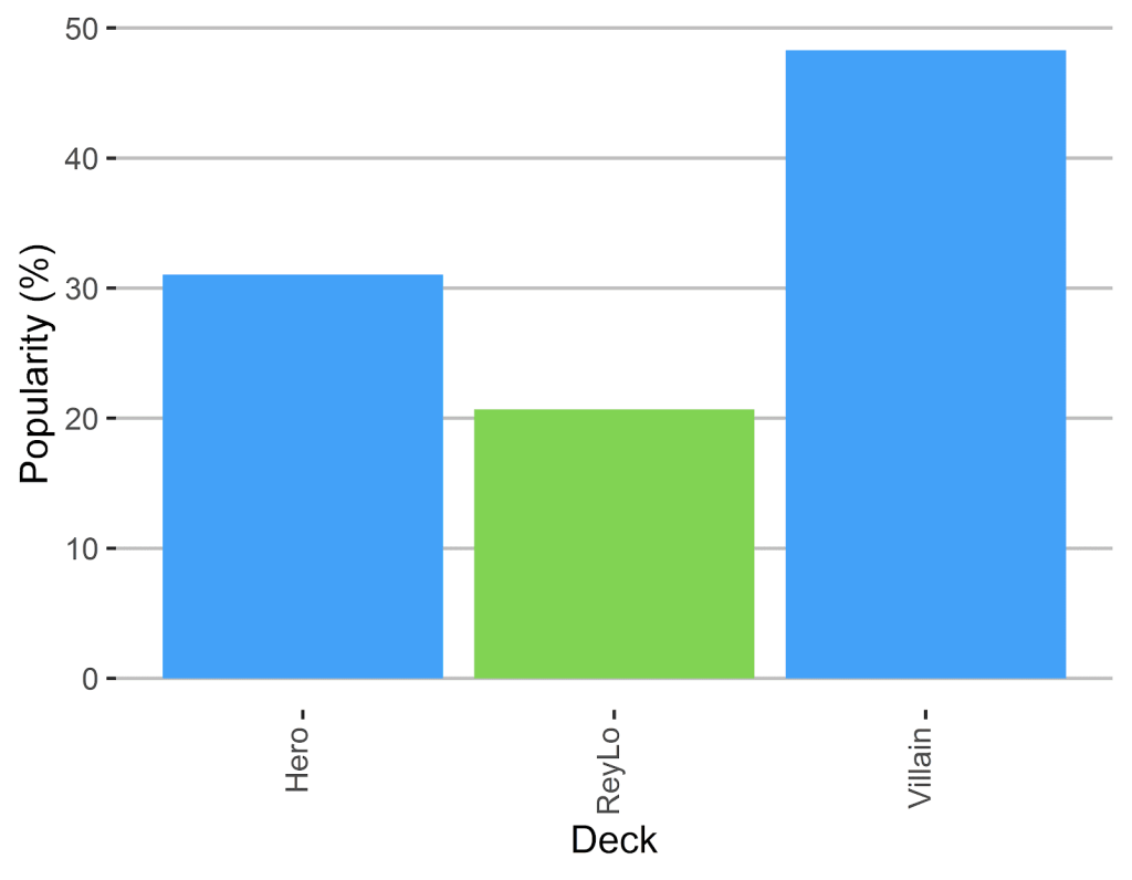 A little biased towards Villain, but not too bad. However, you’re now almost as likely to face ReyLo as all Hero decks put together. Villains on the other hand have quite a few top tier decks to choose from at the moment.