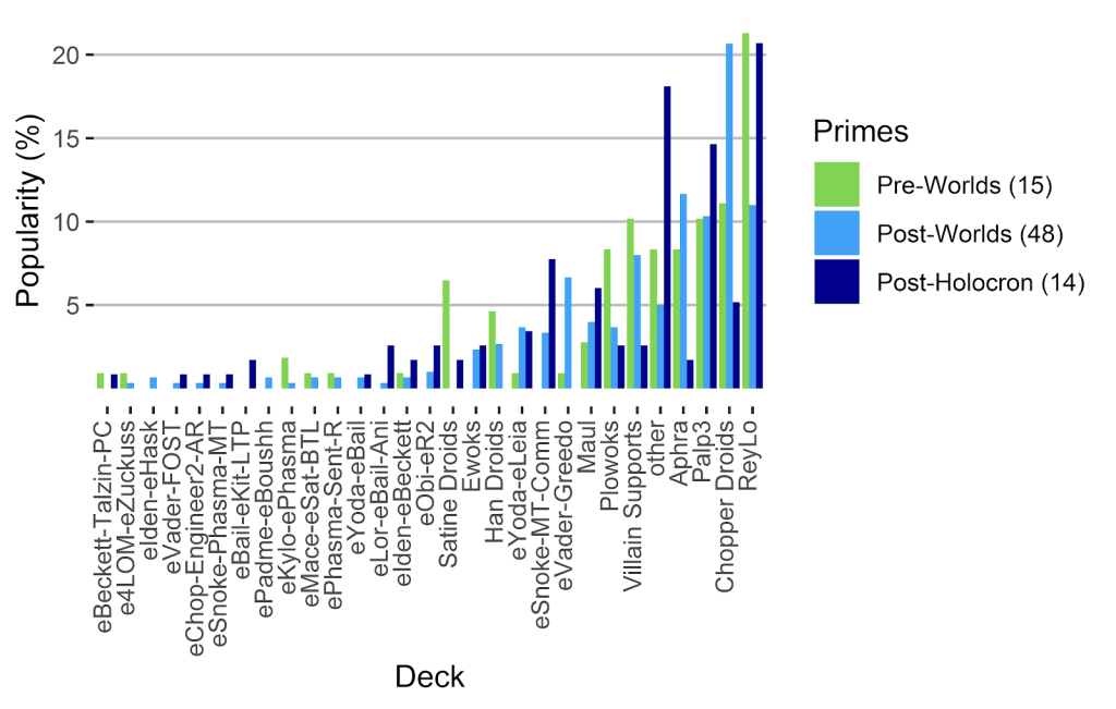 Big winners since the Holocron was released are eSnoke/Mudtrooper/Mando Commando which has gone from 3% to 8% and Palpatine has increased from 10% to 15%. Snoke and Palpatine didn’t get a direct boost from the Holocron, but they were already growing in popularity and appear to have filled the void left by droids and supports. eSnoke-eKallus-Order66 also took down a Prime recently. Seems appropriate for Episode III of my analyses that we are seeing the Revenge of the Sith.