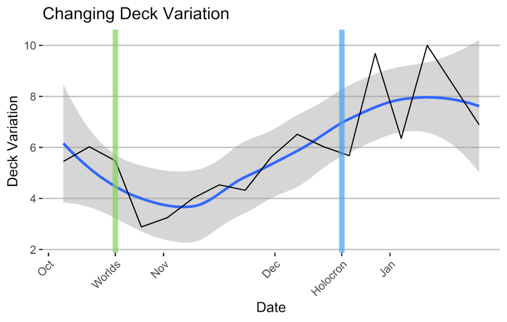 The green line was Worlds, the blue line was the date when the Holocron became live. Looks like since the Prime season started there was a fair bit of variation, but the variation dropped as the meta solidified around a few key decks post-Worlds.
