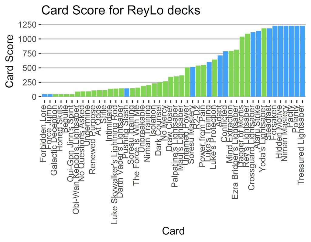 Below is a graph showing the results for ReyLo. The higher the bar, the higher the score. Blue are cards which are two-ofs, Green are singletons: