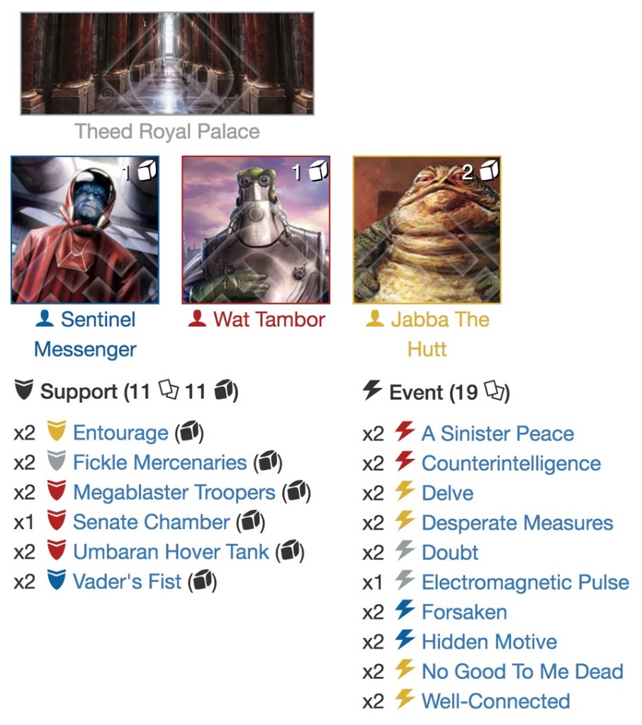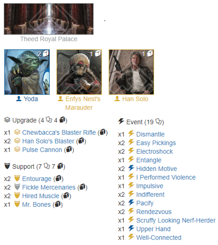 I wanted to play it with double down, the more the merrier right? And to make money, Yoda1/Lando2 was one of my favorite combos. Plus, we have the Yoda special chaining and Lando is a scoundrel. I’ve tried and tried this deck but I’ve never been able to make it competitive. Not enough health, and when Entourage doesn’t show up, it’s a no game. Only the infinite format allowed me some results, thanks to Force Illusion, Force Speed or Second Chance, I managed a performance of 5-1 in Bologna GQ and 5-1 again in Paris GQ, June and July last year. At that point, I thought I could not go competitive by only focusing on Entourage [echo7: yourdestiny did a review of a Yoda1/Han3 deck back in April 2019 which doubles down on Entourage].