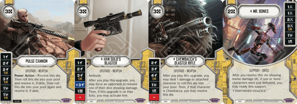 Well, of course the odds to have an Entourage round one every game is not high enough to consider this a consistent strategy. So we need strong/efficient weapon that can do the job when my Entourage doesn’t want to show up: Mr. Bones, Han Solo’s Blaster, Chewbacca’s Blaster Rifle and the Pulse Cannon can all do the job. So that’s why I’m playing it! Don’t forget we have focus thanks to Yoda!