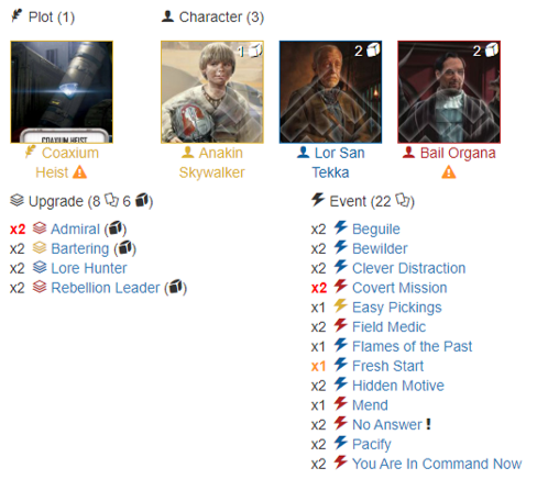 There are some cards which can be literally game winning when played early. Vader’s Fist is the prime example. However, if you tutor it with Covert Mission, then play it, you’ll need 6 resources, or 7 resource to resolve a pay side. That’s a lot. Though not impossible.