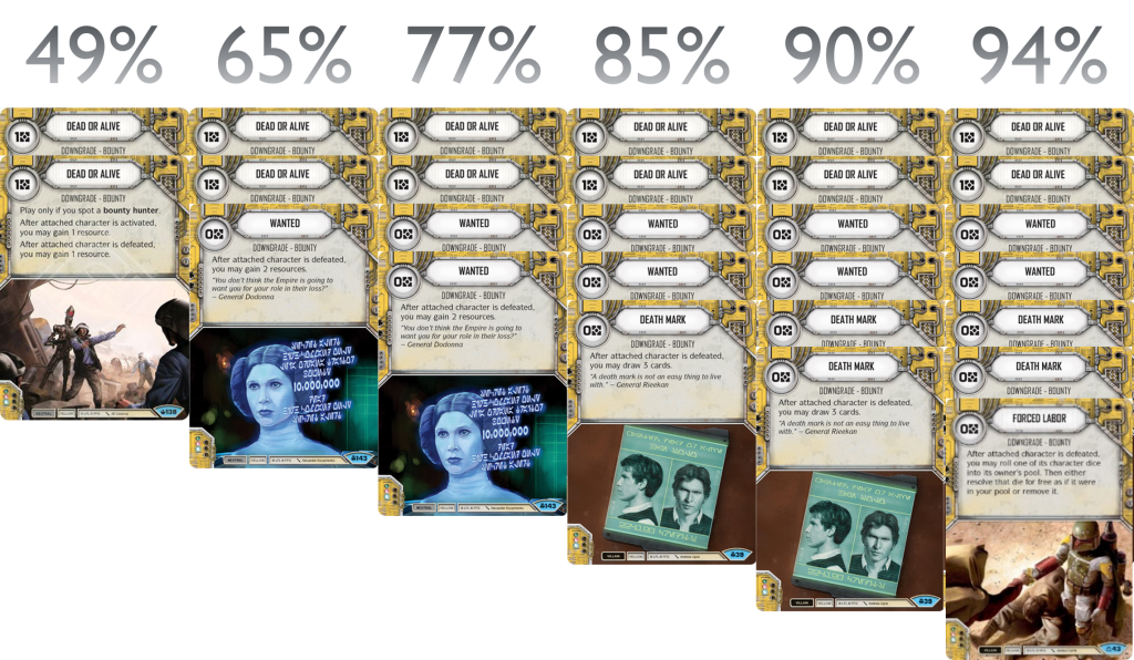Here are the odds on drawing at least one downgrade with a hard mulligan (discarding your entire hand if you don’t get any), based on how many downgrades you have in your deck: