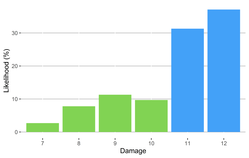 With this strategy, using character dice alone, you can expect to deal 11+ damage 68% of the time and cannot do less than 7.