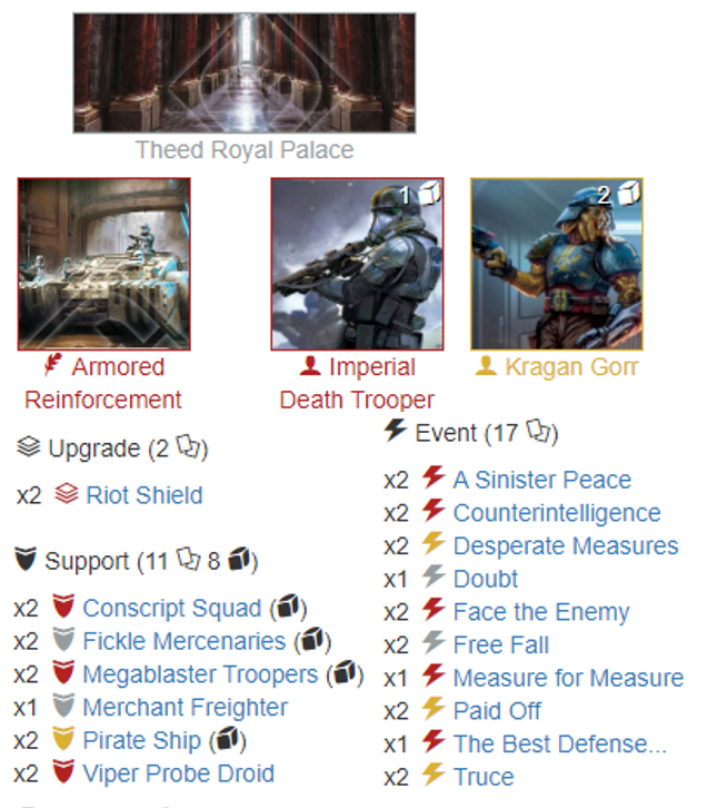 Kragan plus Armored Reinforcement left 11 points. The Imperial Death Trooper felt like the natural fit: he gives access to red which means hand control, strong supports, mitigation and dice consistency.