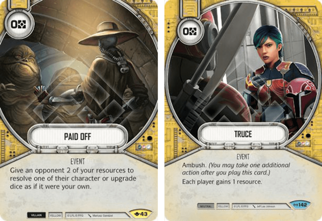 I’ve included Paid Off as a 2-of, as in testing it’s felt strong. The ability to resolve an opponent’s die against them can easily represent a 4-6 damage swing, but typically a 4 resource swing for it hasn’t been worth it. If however you can steal one of them back as your next action, it becomes viable.