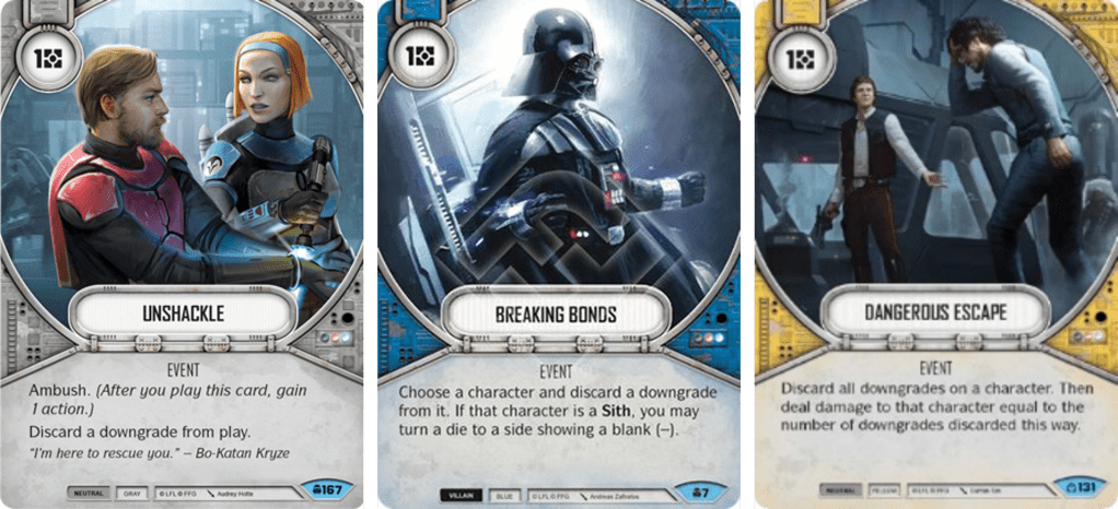 For this reason, downgrade removal may be a worthwhile include. What you include depends on your build: Unshackle is neutral grey; Breaking Bonds has additional upside for Bane/Palpatine decks; Dangerous Escape can discard multiple downgrades and provides from-hand damage for a downgrade deck (so is a consideration for a Trandoshan player, providing them surprise offense and defense in the mirror).