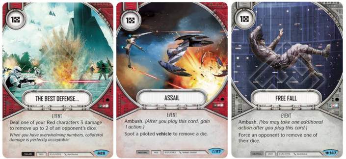 Technically Assail is not multi-die removal. I am including Assail for it’s ambush action: therefore we can simulate multi removal with a combo piece. Play Assail to remove one of his dice, then with the ambush action play a second piece of removal to deal with the other die. Free Fall also fits this mould because of the additional action granted from the event [echo7: I’ve long been a fan of Free Fall, and I think can be very powerful against Death Field as it is likely to be the only card in the opponent’s pool on occasion].