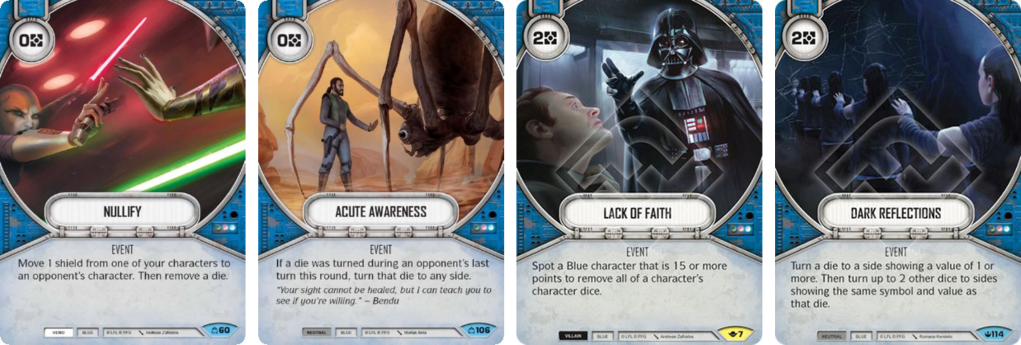 Free removal is what Reylo lives off, so Nullify can join Motive, Forsaken, Pacify. I put in an Acute Awareness particularly for Trando’s PA, but never met them, it still proved useful as most decks turn dice, even if it’s soft removal – it needs to be timed right. The other anti Trandos card I put in was Lack of Faith, which never had to be used, so maybe it was a bad call – it’s already been replaced by Dark Reflections as my Surprise! card.