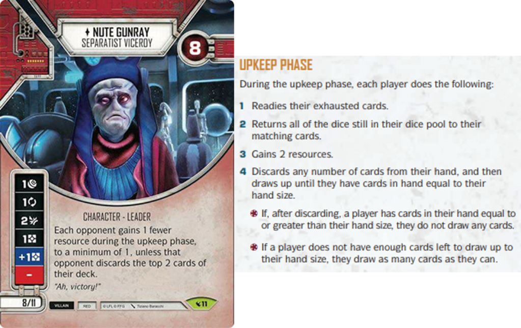 Bane might have mixed up sides, but so long as he’s got a big upgrade on him, he has no bad sides. That double shield side is handy when you’re essentially playing a 14 health deck. I’ll also take the resource side if it means I can afford to play The Best Defense…, or ramp into a Death Field, or drop an Ancient Sith Armour. This means that even with almost no focus sides, you rarely have to re-roll.