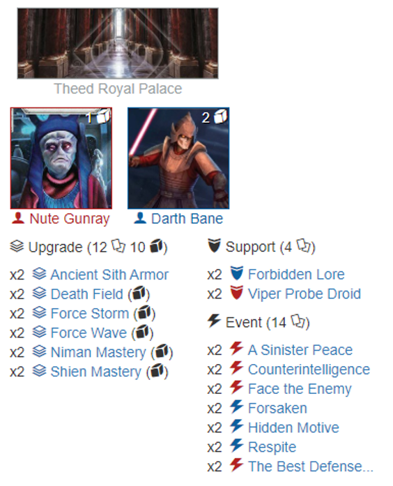 Ancient Sith Armor is currently in the deck, and can sometimes be fantastic thanks to its ability to absorb two damage a turn if you’re playing/overwriting abilities. But taking up an upgrade slot and costing 2 resources means it can under-perform in some games. I may swap this for some additional mitigation at a later date, such as Lack of Faith, Beguile, Dive or Under Attack.