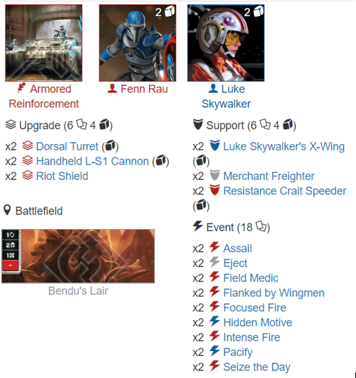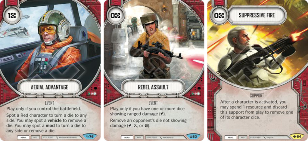 Compared to The Gandork’s build I’ve gone deeper with dice removal. Suppressive Fire to help handle Bane & Trandoshan decks. Rebel Assault felt like a worthy include due to the amount of ranged side’s available and for Zero cost this feels worthy of a slot to deal with pesky specials or mis-rolled damage dice.