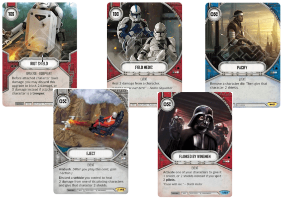 Survival cards such as Field Medic, Eject, Flanked By Wingmen, Riot Shield and Pacify all help to keep your characters in the game that little bit longer. All these defensive cards act as mitigation. They are mitigating re-actively or pro-actively, before and after the damage has been dealt rather than the standard mitigation that most decks run in removing dice. The straight-up removal package is limited to Hidden Motive and Assail [echo7: I think this approach to mitigation is a great shout if there’s a lot of action cheating around, such as C-3PO].