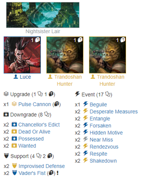 So far, the double Trando/IDT deck has been the go-to Trandoshan deck, but last week a new pairing reared its head: Double Trandoshan/Luce, designed and piloted by Wotjek “Hipo” Wisniewski of Krakow’s Krak Dragon Howlers.