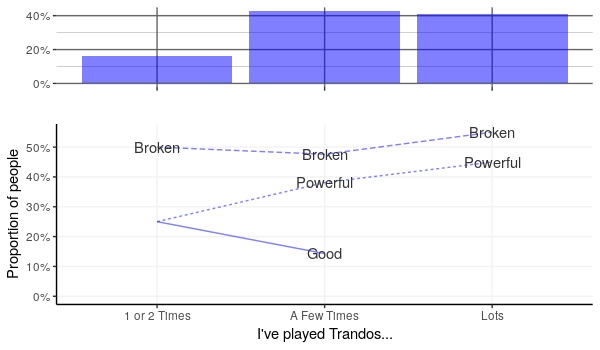 As you go to the right in the above graph, you’re looking at people who have tested Trandos more and more. The bars at the top tell you how many people fell into each category of testing: a 20/40/40 split between respondents having played a couple, a few, and lots of games.