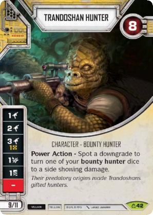 This fix retains the points and non-unique elite flair of the character, but just makes the Power Action much more fair. Having to play 2 downgrades to flip to the double ranged side (or 3 for the triple) is perfectly feasible, even in round 1, but is just that bit harder. Plus only being able to focus his own die means if you nuts roll one Trandoshan and double blank the other, you can no longer Power Action both blanks.