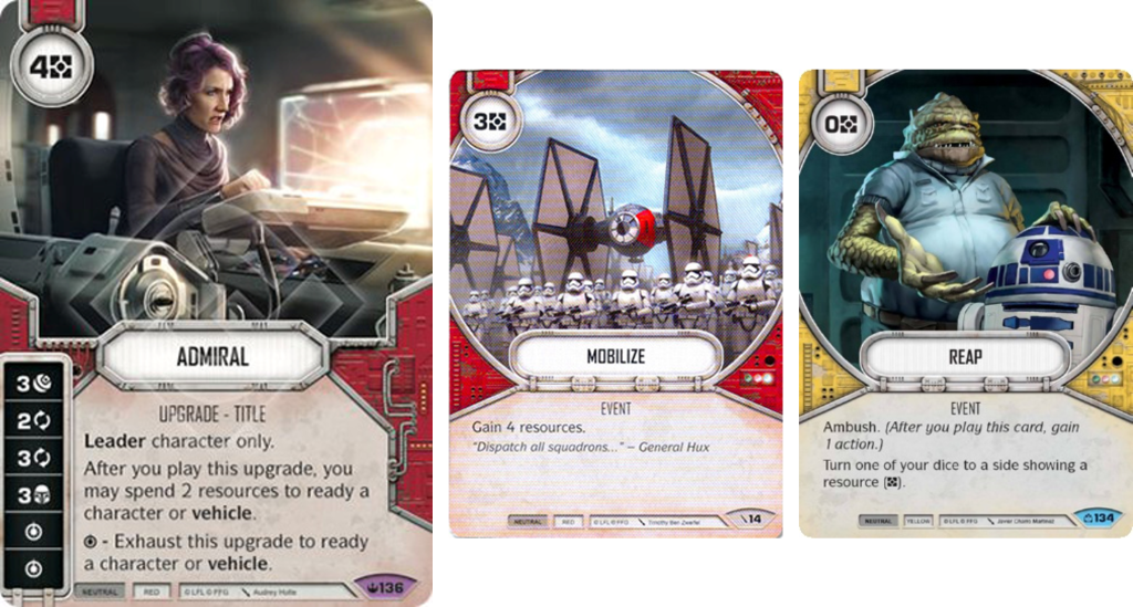 Reap is a very good card, combined with Krennic’s ability to turn to a 1 resource side, you can Reap into Jabba’s +2 side, and get 3 resources, independent of what you naturally rolled. It isn’t necessary to keep Reap on the mulligan, since you can pull it from Jabba’s activation, and Admiral and Mobilize are more important.