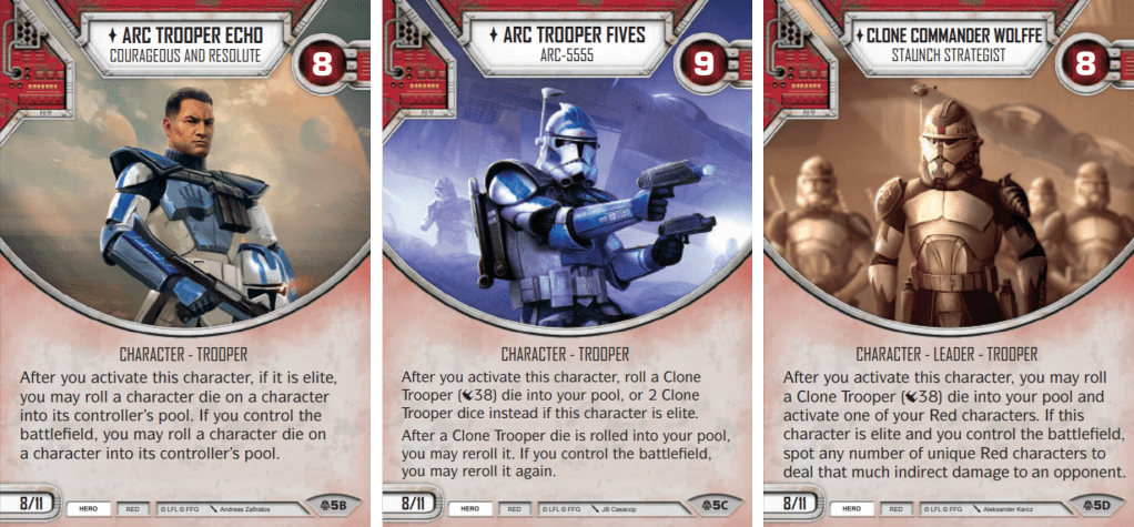 Exhaust Fateful Companions to Roll in two Clone Trooper dice. If you control the battlefield you may re-roll those dice up to two times each, or once if you don’t