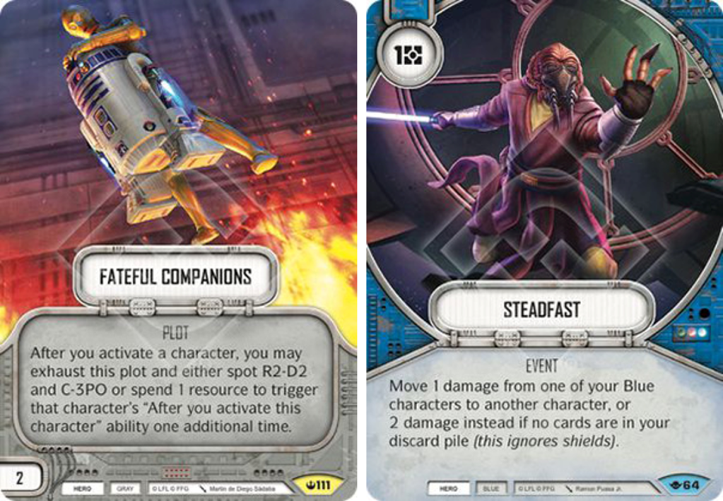 Fateful Companions is going to see a lot of play with Transformations characters (see our Clone Trooper article from yesterday), and with Anakin it’s giving you 4 direct damage on activation for 1 resource, which is unprecedented. Sure, Anakin takes two damage, but if you pick the opponent’s battlefield he’ll start with 2 shields. Alternatively, you hard mulligan for Steadfast, meaning you can deal 6 damage for two resources before you’ve even resolved a die. This makes the deck highly aggressive, which I think is going to be strong in the current meta.