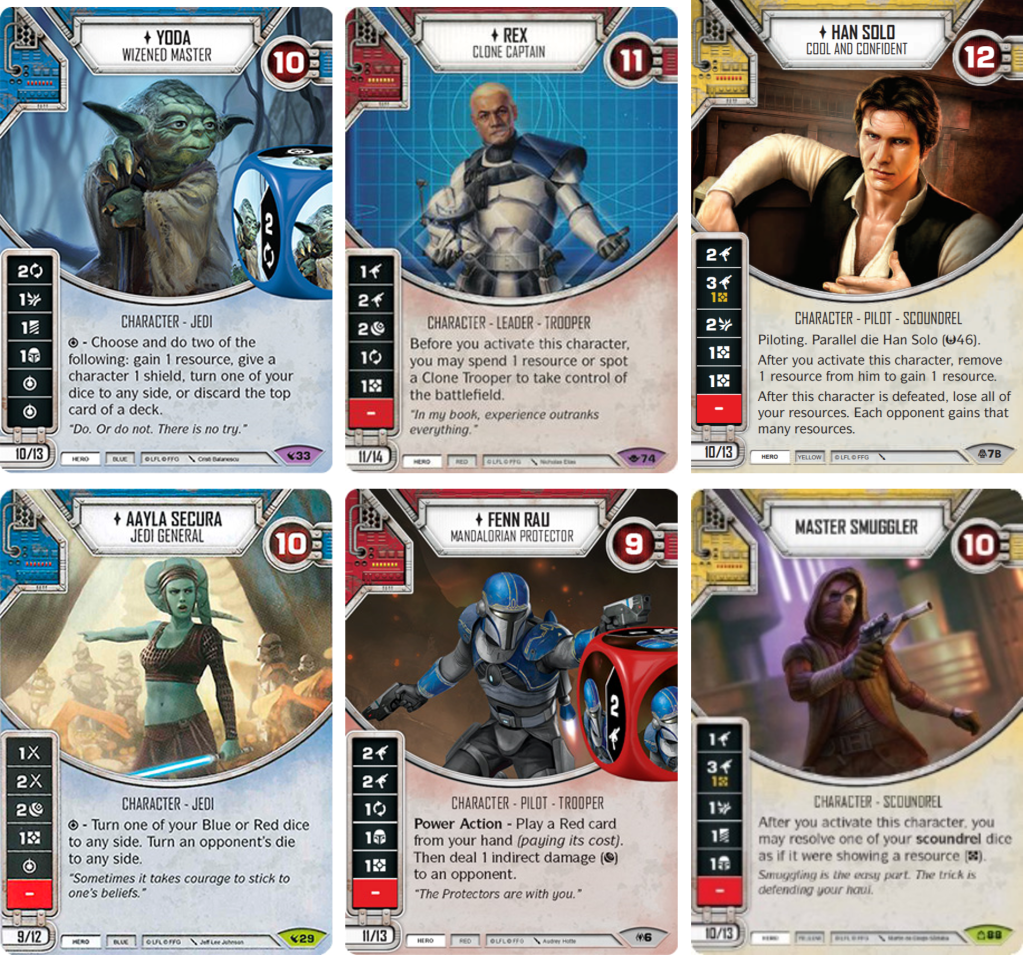 My favourites for each colour are Yoda, Rex and Han, but I think there might be room for Aayla, Fenn or the Smuggler. The last one there may seem an odd choice, but given you’ll be down a resource early thanks to Fateful, a 97% chance of a resource or 30% chance of two resources as your first action seems good.