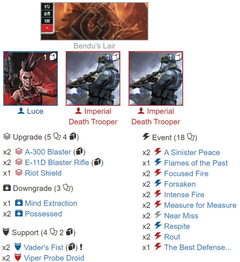 OK, so my days as Trando Whisperer are over [echo7: this was written before the official Holocron was released, in the days when we were treating Trandos as 12 points elite. Despite staying on 11 points, they still took a hit by being added to the restricted list], but I wasn’t ready to give up on the deck archetype just yet. Or on Luce for that matter, as I’ve grown to love this character…