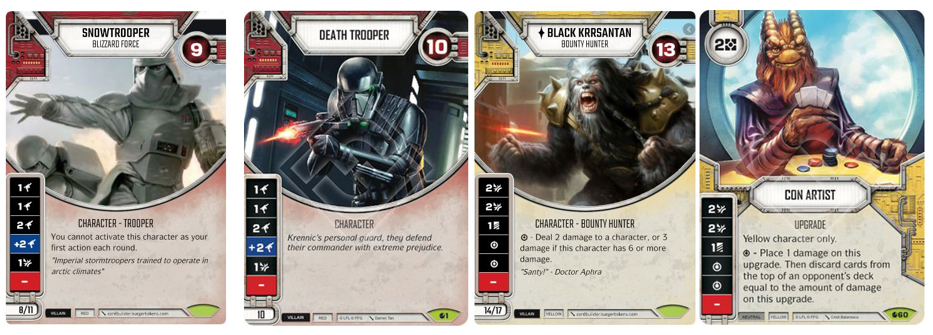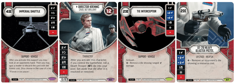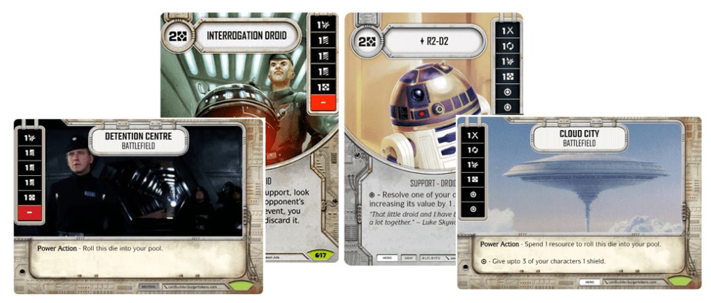3. Snowtrooper shared sides with the original Death Trooper, 4. BK was Con Artist5. Imperial shuttle used Krennic’s sides, 6. TIE Interceptor borrowed sides from the DT-297. Cara Dune took Baze’s sides, 8. Tantive IV borrowed sides from Baze’s Spirit of Rebellion partner “Snap”9. Rather thematically, the Detention Centre was based on the Interrogation Droid, 10. Cloud City used R2-D2