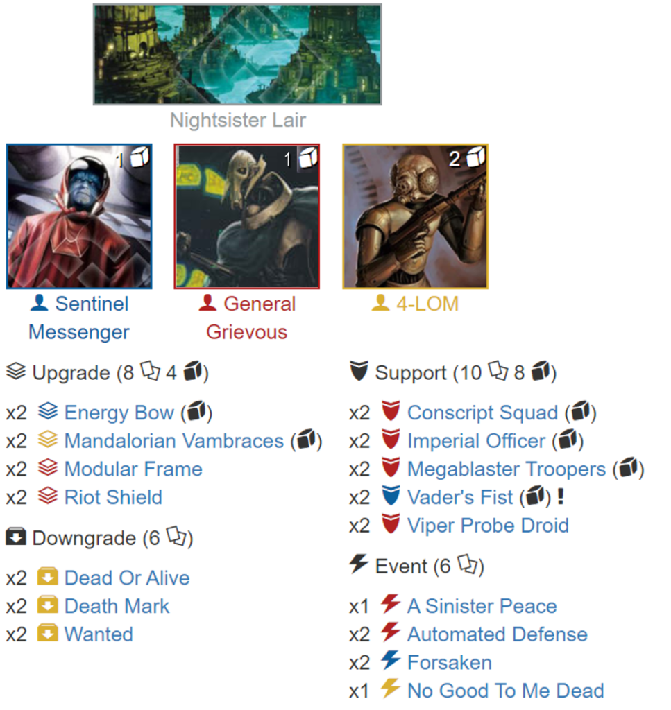 I think the best place to start when talking about the deck, is the characters. Here, you’re playing 4-LOM elite at 15 points, Sentinel at 8 points, and General Grievous (Droid Armies Commander) at 9 points. You’re allowed to do this, of course, because Grievous decreases the point costs of each of your droid characters by 1. And this brings us to the first strength of the deck: you’re working with 32 points’ worth of characters. You get to bring in the Sentinel, one of the strongest characters ever to be printed, at just 7 points. You get to bring in 4-LOM, who has one of the most consistent dice in the game and an enormous 12 health, at 14 points (not to mention 4-LOM‘s ability can buy you rounds in the mill matchup). On top of all that, you get a free re-roll on these dice with the Grievous power action. All in all, the character pairing is what makes the deck tick. You’ve got 29 health, rainbow, and incredible synergy all wrapped up in a neat 30 point package.