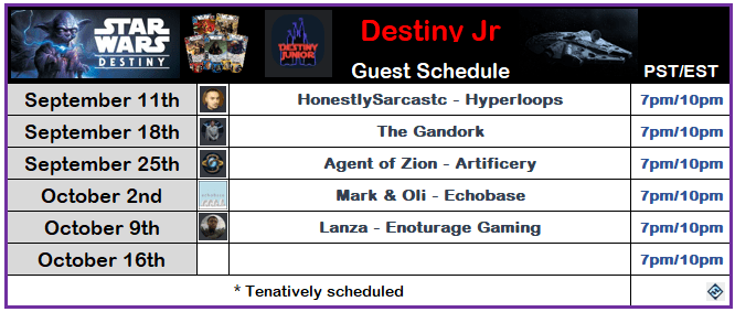 Recently, the ever popular L8 Night Gaming destiny nights ceased to be. Fortunately, Destiny Junior (Discord/youtube) have taken up the mantle and will be replacing these events, sticking with the same format of casual decks being played, and a new guest every week. Here’s the schedule for the first few weeks: