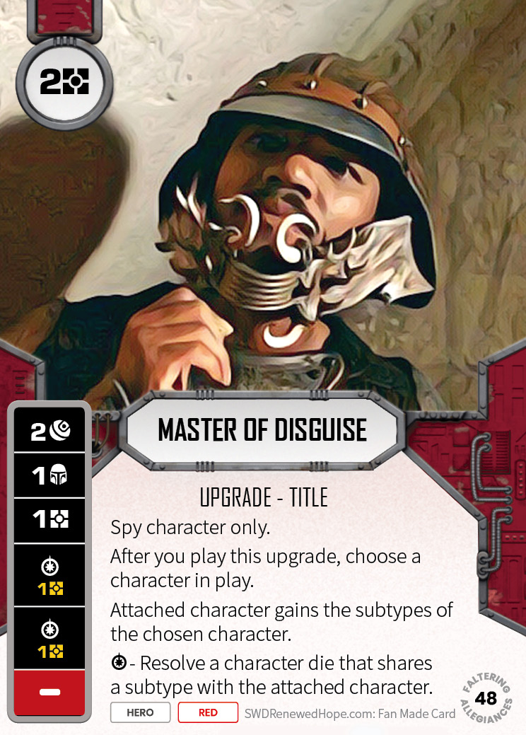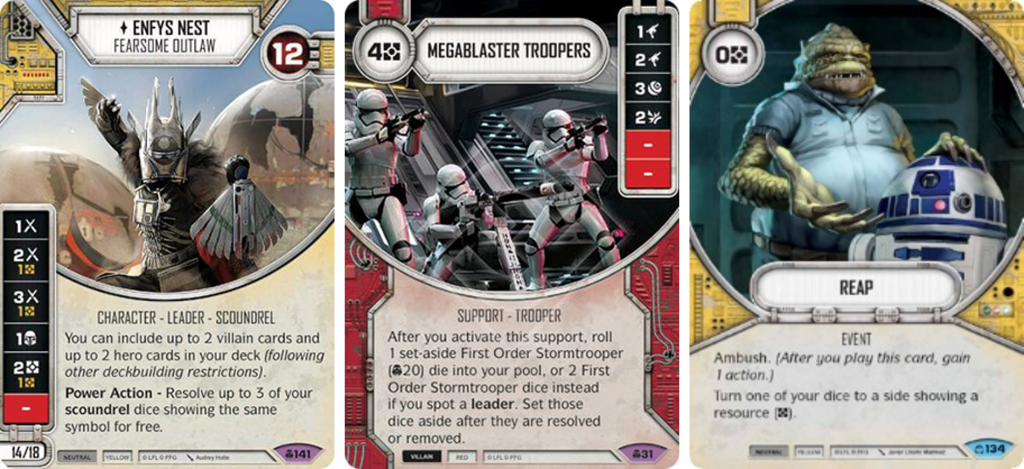 One such yellow leader could be eEnfys Nest. She brings with her two villain cards, meaning Cassian could be used to ready Megablaster Troopers and spam the board with 6 dice. Ramping into 4 resources should be pretty easy with a Reap into an Enfys Power Action on her resource side (plus some help from a double use of the Mechant Freigher). And remember that you can roll in more First Order Stormtrooper dice to your pool even if you have some in there already from the first activation of the Megablasters. You might also think about including Master of Disguise to make Cassian a leader (and scoundrel) too. It’s just a shame that Strategic Planning is rotating out…
