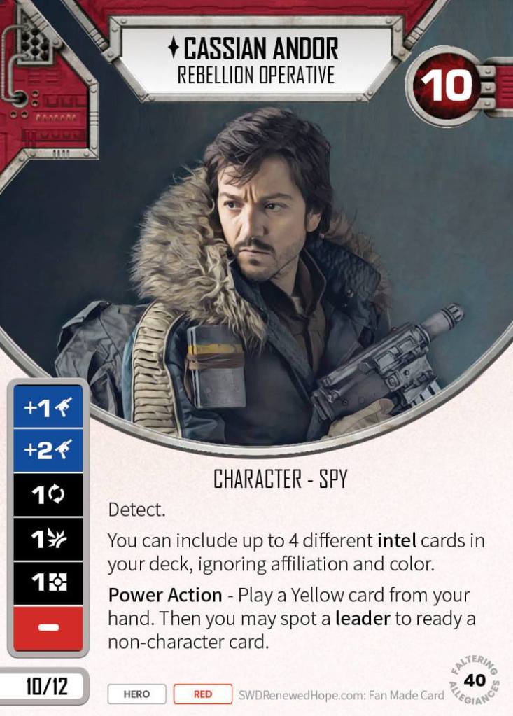 The obvious thematic pairing for Cassian is eJyn. Assuming we get at least two new yellow Intel cards in hero or villain, we can have 4 yellows in our deck. Also, we get to run the United plot elite, which is going to be huge with Jyn. You could then potentially use Cassian to ready Admiral on Jyn for 3 activations of her per round.