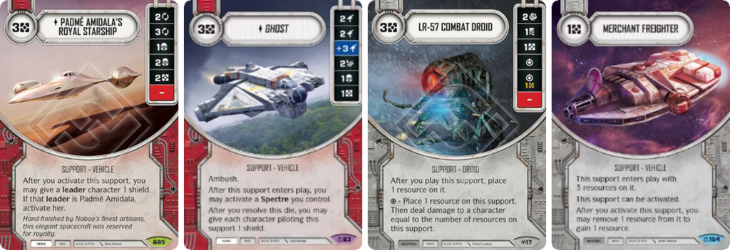 A more consistent target for Cass’ ability may be a support such as Padmé Amidala’s Starship (which would give Jyn two free shields per round), Ghost, or even the LR-57 Combat Droid (complete with droid mods) to load up that special, or a Mechant Freighter for some extra ramp. If you’re interested, here’s a link to all possible dice supports for this pairing in the new standard.