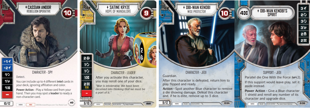 One final idea, which may be a little silly but could be fun: Cassian/eSatine/Obi-Wan(Tr). If you defeat Obi-Wan in the first round of the game, you could be looking at getting 2 uses out of his spirit per round.