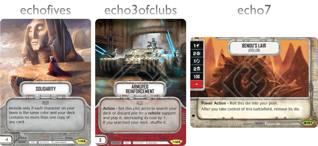 echofives: Solidarity. How many times have you wanted 31 points worth of characters. Well, this let you albeit with a very interesting draw back that made you dig deep into the card pool. You had to be one colour and could only pack one of each card. This made for very interesting and different decks. My favourite and most successful was eAayla Secura, eAhsoka Tano and Vigilant Jedi.