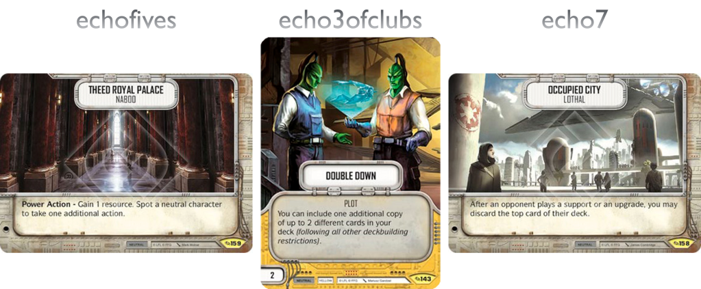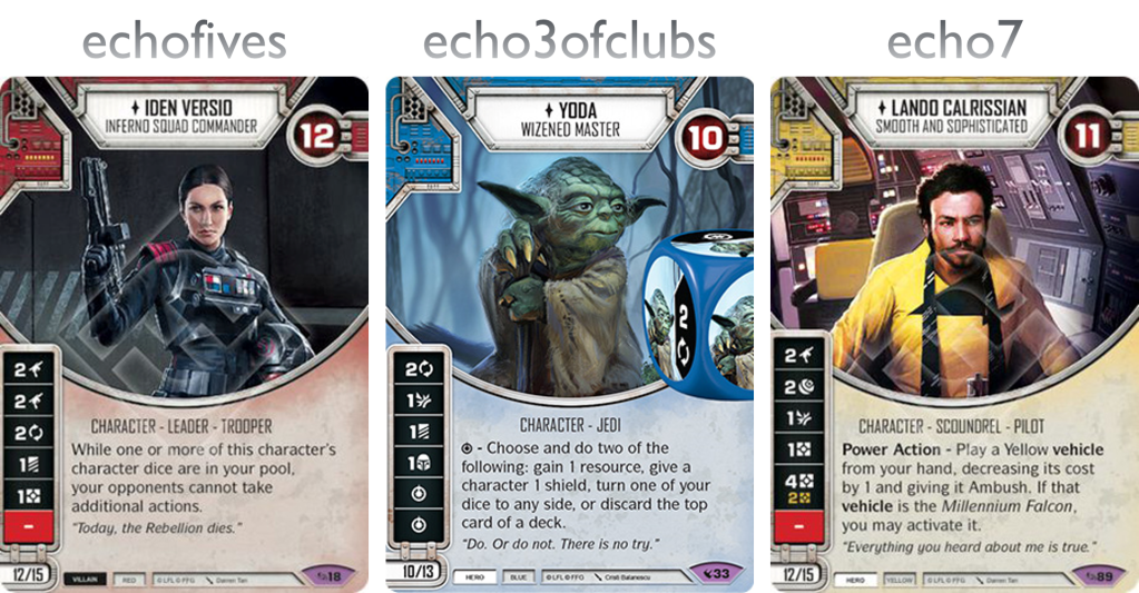echo7: Lando is such a fun character to play. His Power Action was great for dropping cheap vehicles (even if there have never been many great yellow vehicles) and that 4 resource side proved highly versatile, from mill with Leia and Stealthy, to fast ramp especially when partnered with Enfys Nest and combined with Reap (one of echofives‘ favourites I believe).