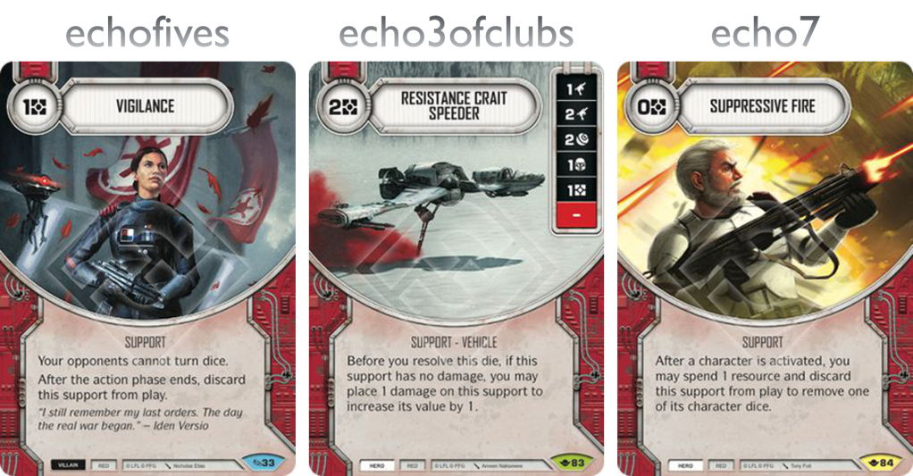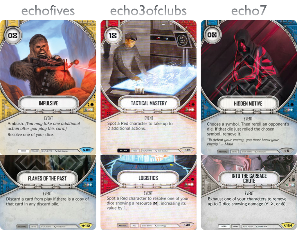 echofives: Vigilance has saved me games. Remember the two focus sides I mentioned earlier. They were everywhere. This card shuts it down. Since then it got better, Rey can’t turn Kylo to the special. Niman can’t mess with my dice. R2-D2 gets shut down. If only it stayed in play but alas it is for one round only. But that round could be the crucial one.