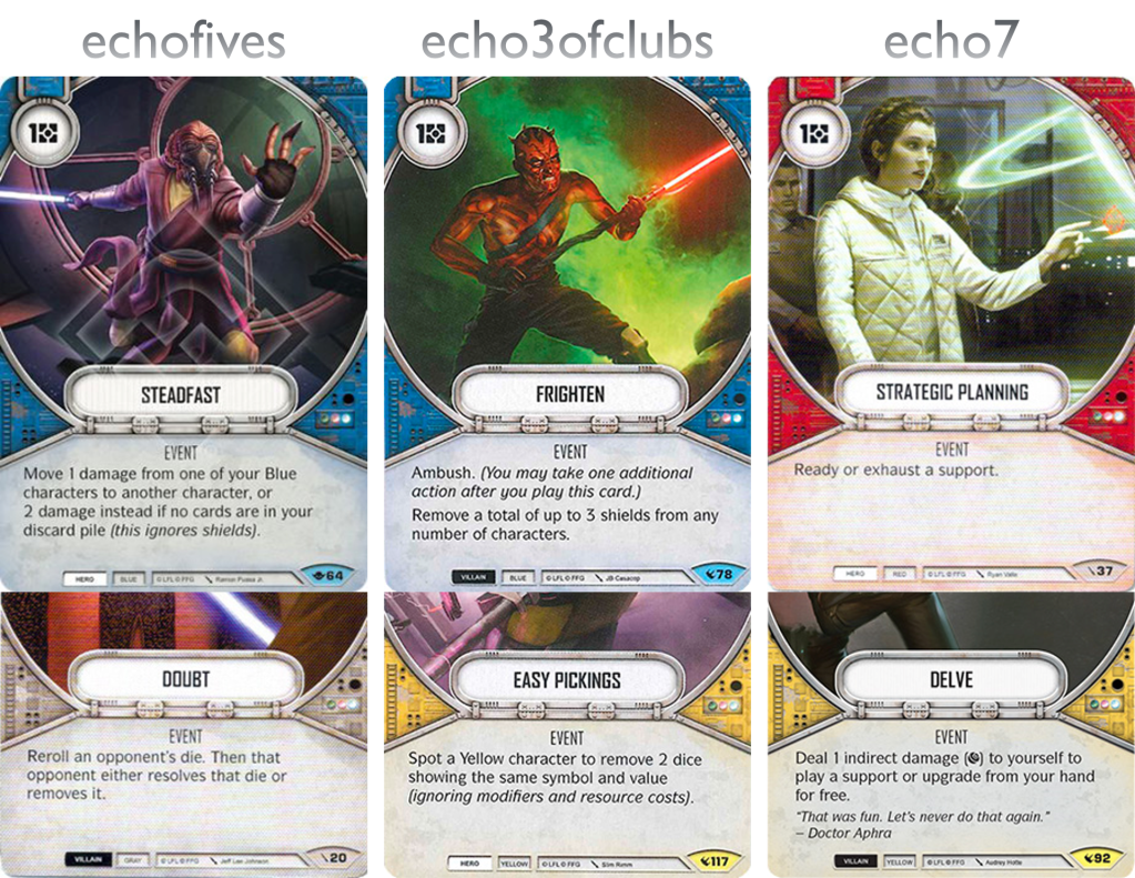 echo3ofclubs: We’ve all played Vader’s Fist and we all secretly love it. Getting to 5 resources is pretty easy to do in the current state of Destiny and given the impact this card has had on the meta I’ve always been surprised that this card never received even a small errata. It’s the ultimate feel bad card when your opponent slams this on the table. “Fist? – GG“.