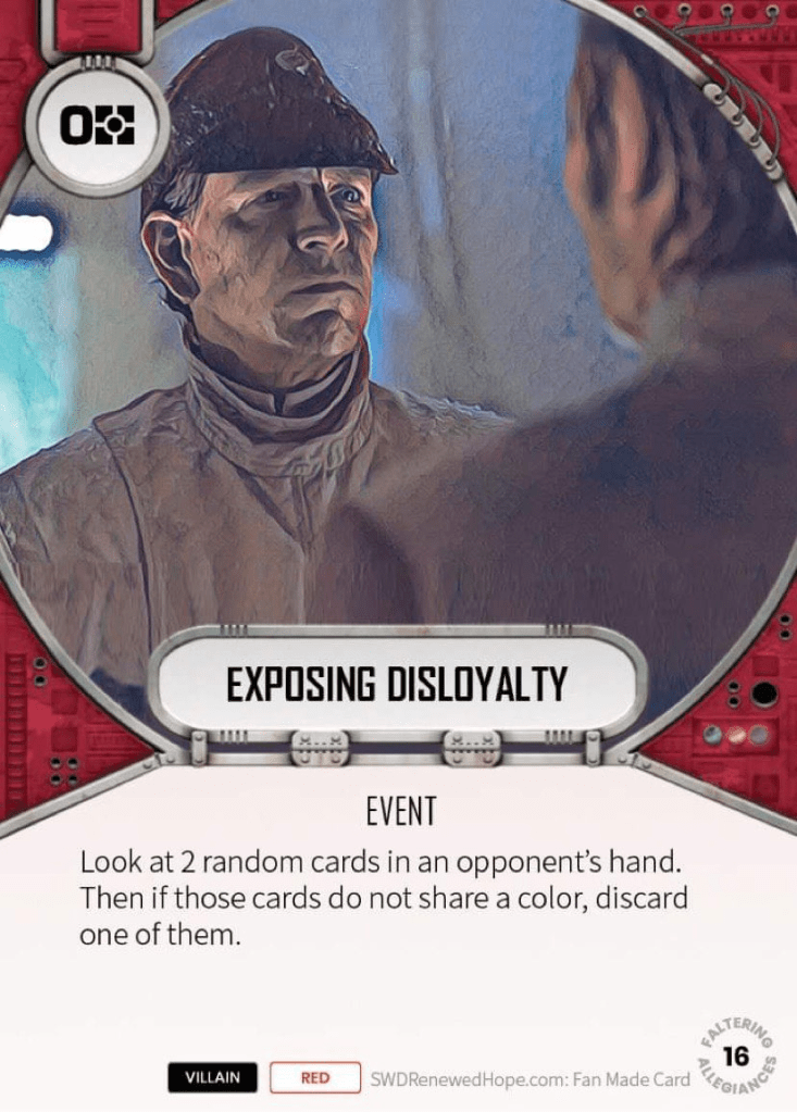 Villain red hand control at its finest. A well crafted card with an interesting effect that fits perfectly with the title. To be honest, I’m probably going to be running Counterintelligence (if I’ve got a leader) or Probe before this card, but I just love the concept, and it is going to absolutely suck to have this played against you if it hits.