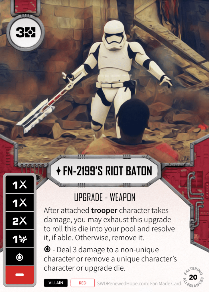 Talking of FN-2199’s Riot (Control) Baton, here it is. For 3 resources, this is not a great die, but if it’s on a trooper and that trooper takes damage, you potentially get two uses out of it (and it is ‘takes damage’, meaning you have to actually be placing damage on him, not blocking it with shields). It’s certainly a good die to gamble on, with 4 or 5 live sides at any one time, but they’re quite small sides.