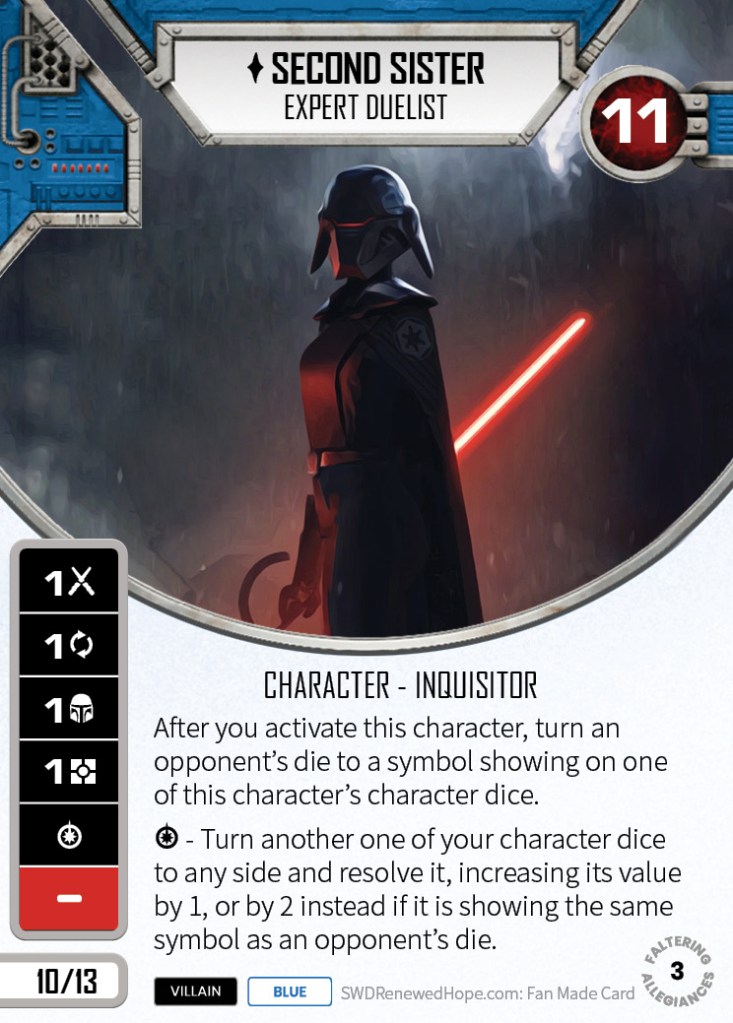Continuing with the Fallen Order theme of the set, we get a villain from the game: Second Sister. 10/13 for 11 health is good, but those dice sides are not. Her after ability feels like it could be handy, especially if you roll a blank, but it could be problematic, as it’s non-optional.