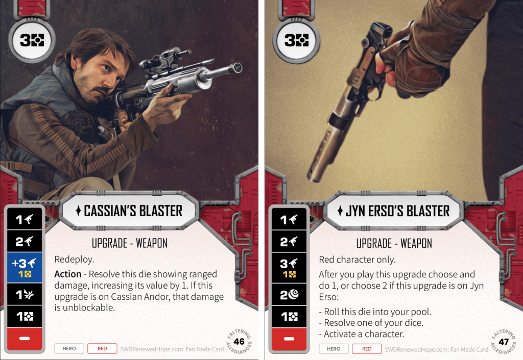 Cassian and Jyn get new guns, and they’re both pretty good. Cass‘ is my favourite, as combined with the Power Action those are big base sides. In fact, the only 3 drop upgrade with redeploy that features an effective 3 damage non-pay base side so far is Heirloom Lightsaber (and the Sith Warblade), though this has the big disadvantage that it’s slower and can’t be modified. I feel it’s going to be a little frustrating though combining this weapon with new Cassian because you might end up stranding one of his modify sides.