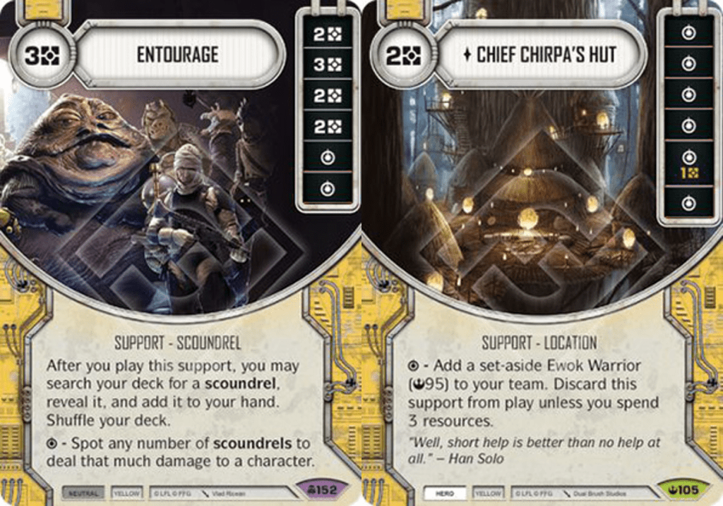 Change of Plans is a card that makes me want to play yellow hero. Not since the days of C-3PO have we been able to resolve a die as any side we want, but that’s what this lets you do, meaning you can resolve the blank on Entourage for the special, or that 3 indirect side for 3 money. Other than Entourage, there’s not many obvious targets for this, but this does make cards like Hired Muscle, Mining Guild TIE Fighter and Canto Bight Security look not half bad, and you could even resolve any non-special side of Chirpa’s Hut as a non-pay special side. OK, that last one isn’t terribly likely, but it does highlight some of the versatility of this card: 5/5