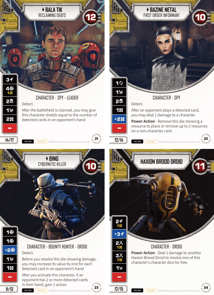 Bing (from Fallen Order) is a curious character, who really needs a partner who’s detecting cards to pay off. If you can Detect a card before activating her, she could be dealing 6 or 7 damage on activation thanks to her built in action cheating. Sure, you can play around it, but you’re forcing the opponent to discard or play their detected card as their next action, which can really mess with their sequencing: 4/5