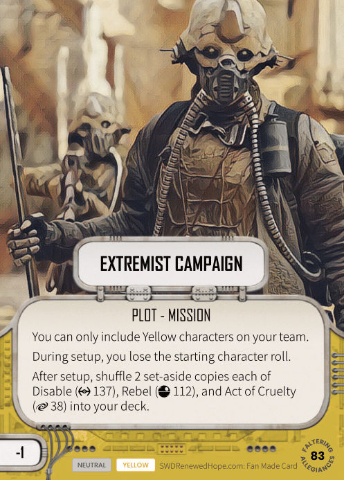 This plot makes eSaw/2Rebel Partisan possible (and makes the Partisan ability make more sense as you’re milling a 36 card deck) but really just allows any mono yellow deck to go to 31 points, which is pretty interesting. I love that the this plot is nicely thematic too: you have to play with rogues only and the cards that get added to the deck feel appropriate for an insurgency; plus the partisans are forced to fight in occupied territory, so lose the battlefield roll-off.