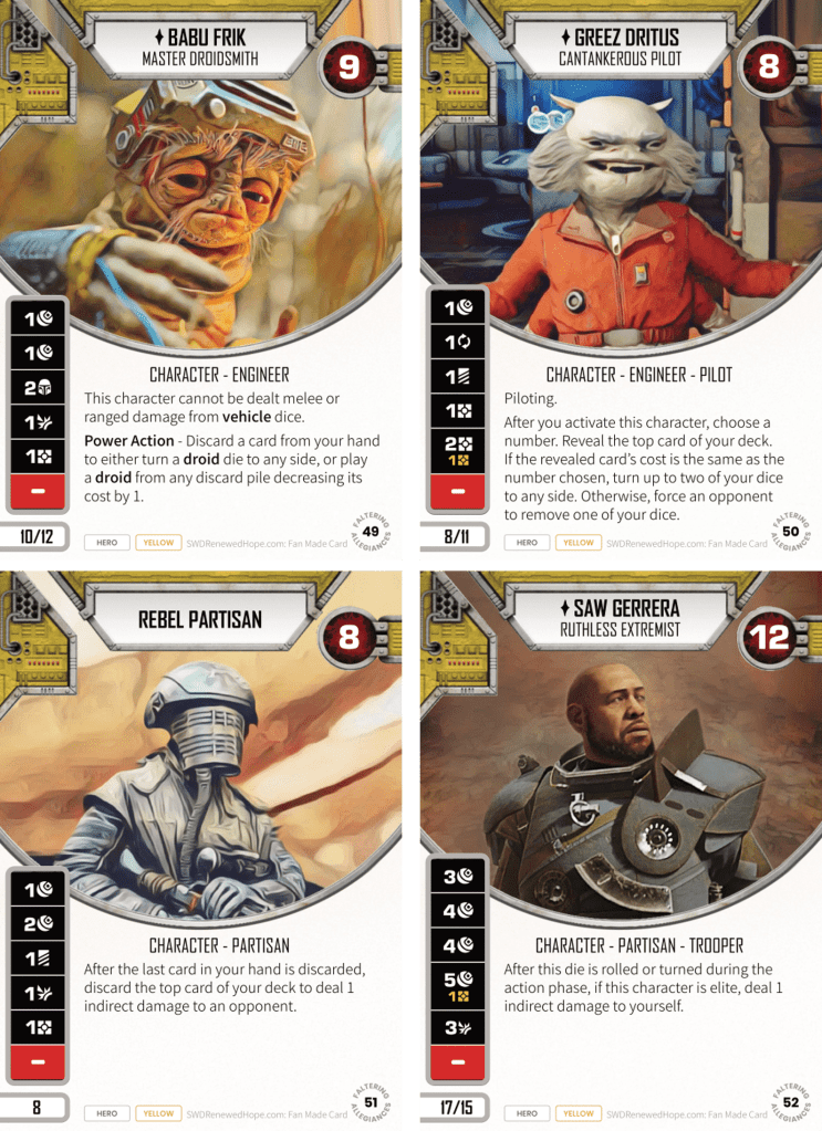 We didn’t get around to reviewing Babu Frik. This little guy’s passive ability would be super strong against a vehicle rich meta, but I don’t think there’s enough direct damage dealing vehicles in the format to make this even a remote possibility. I would have liked it if it hadn’t been a blanket ban on direct damage though, as a just-in-case, such as a high penalty for dealing him damage, like discarding a card for each die resolved.