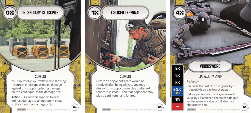 Trash to Treasure looks really good for yellow and/or scavenger decks. Most decks are going to be packing at least one of weapons or vehicles, and if you’re playing 3-wide yellow you can play one of the many 3 cost unique upgrades or a Vibrosword for just the cost of the event from the opponent’s discard pile. The presence of this card also means you’re going to have to make sure you have a die for every upgrade in your deck like you’re supposed to, even on casual night, rather than just one copy of each of the unique dice (and 3 Cal’s Saber dice if you want to use its Power Action, though I don’t believe your opponent could use the PA unless they too had that card in their deck and therefore had their own copy of the die set aside). I normally would never give a situational card a high rating, but I think this one deserves it: 4/5