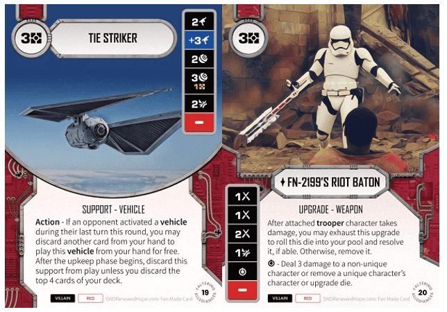 FN-2199’S Riot Baton – For 3 resources, this is not a great die, but if it’s on a trooper and that trooper takes damage, you potentially get two uses out of it. One thing to note is this ability gets triggered whenever the attached character takes damage. So if your trooper takes damage when this die is already in your pool, you can exhaust the upgrade to resolve it. Alternatively, you can choose to do nothing and just keep the die in your pool (as when you choose not to exhaust the upgrade you are passing on the entire after-effect): 3/5