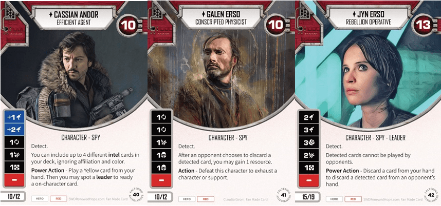 I feel like these guys are the main focus of the set. Each of these guys carries the new keyword, Detect, and the new subtype, Spy. Thematically you can pair Jyn with either Cassian or Galan both elite with the plot Intelligence Operation.