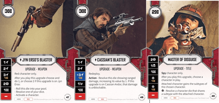 Jyn’s Blaster is going to be great for tempo on Jyn. Being able to play it, roll it in and then resolve it is a strong play, so long as you’ve saved a resource to resolve that pay side. 4 damage sides and a resource is basically exactly what you want from an upgrade: 4/5